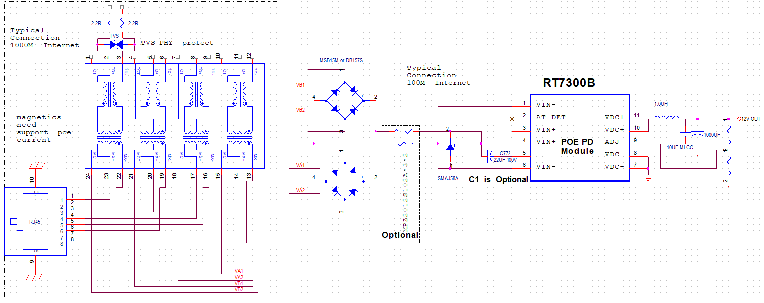 If the PSE does not support the Physical Layer classification, Opto1 will be OFF. The RT7300 will operate with non IEEE802.3at compliant POE+ PSE’s.