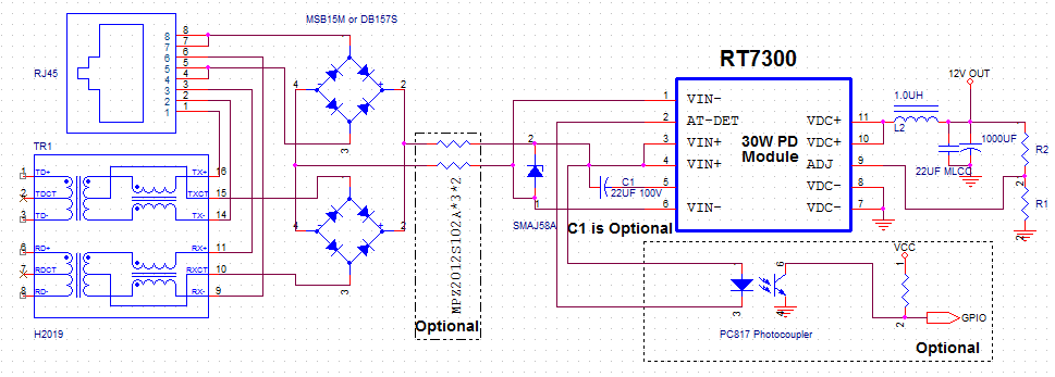 The RT7300 has an AT-DET output pin which is used to detect a Two Event Physical Layer classification as described in IEEE802.3at. If required the AT-DET pin can be connected directly to an opto-coupler.